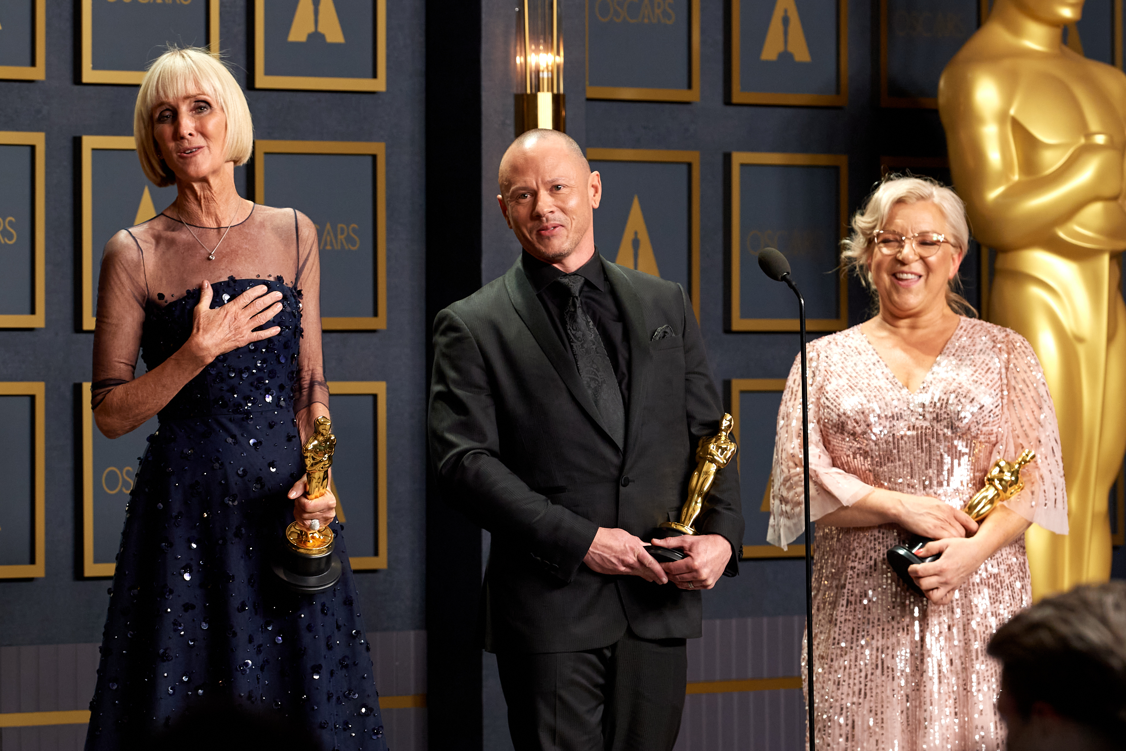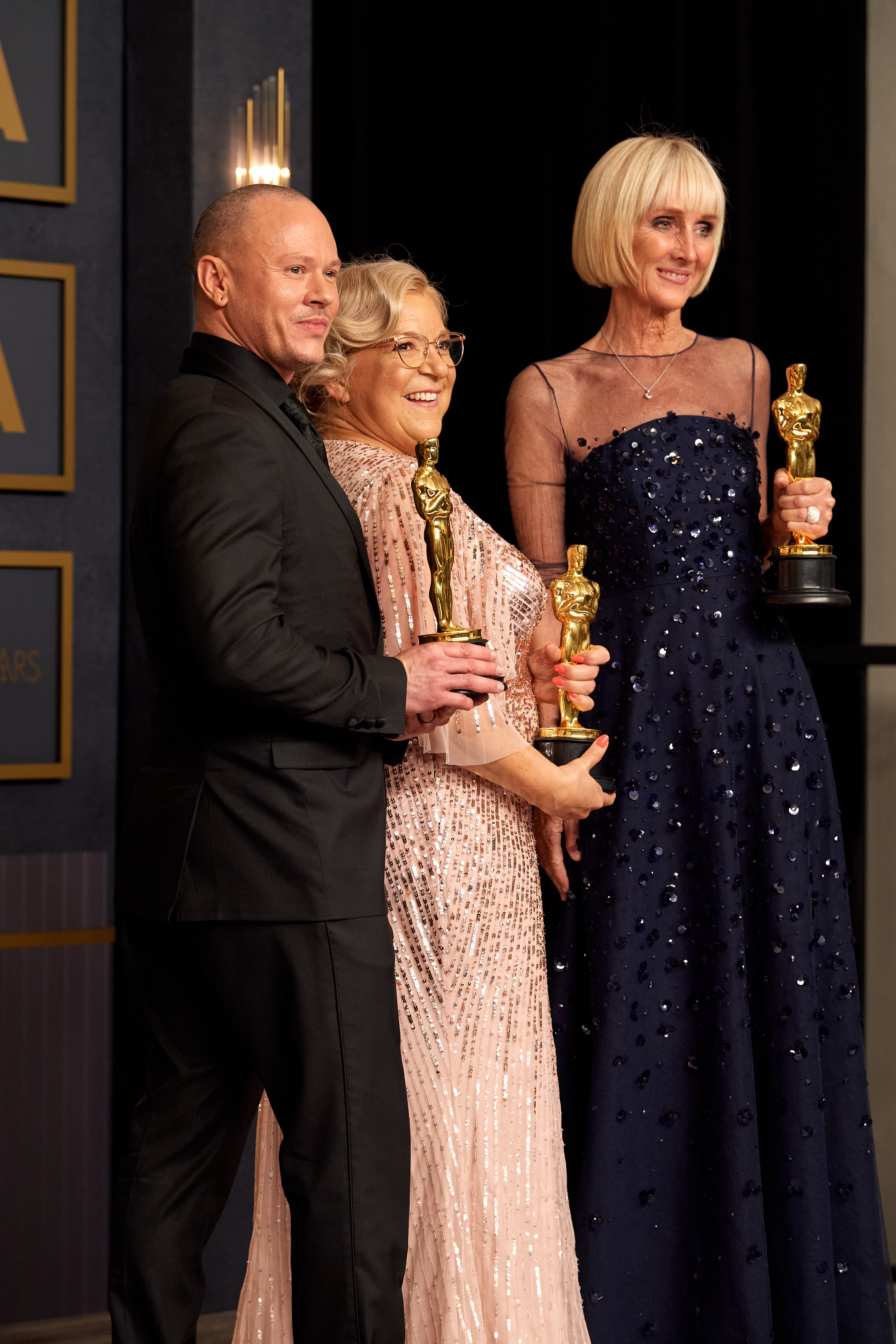 Filename: 94_PR_0306.jpg Size: 3,578w by 2,385h. 3,426,366 bytes Date: 03/27/2022 Download Hi Rez Preview Linda Dowds, Stephanie Ingram, and Justin Raleigh pose backstage with the Oscar® for Makeup and Hairstyling during the live ABC telecast of the 94th Oscars® at the Dolby Theatre at Ovation Hollywood in Los Angeles, CA, on Sunday, March 27, 2022. keywords: 94th Oscars, Academy Awards credit: Michael Yada / A.M.P.A.S.