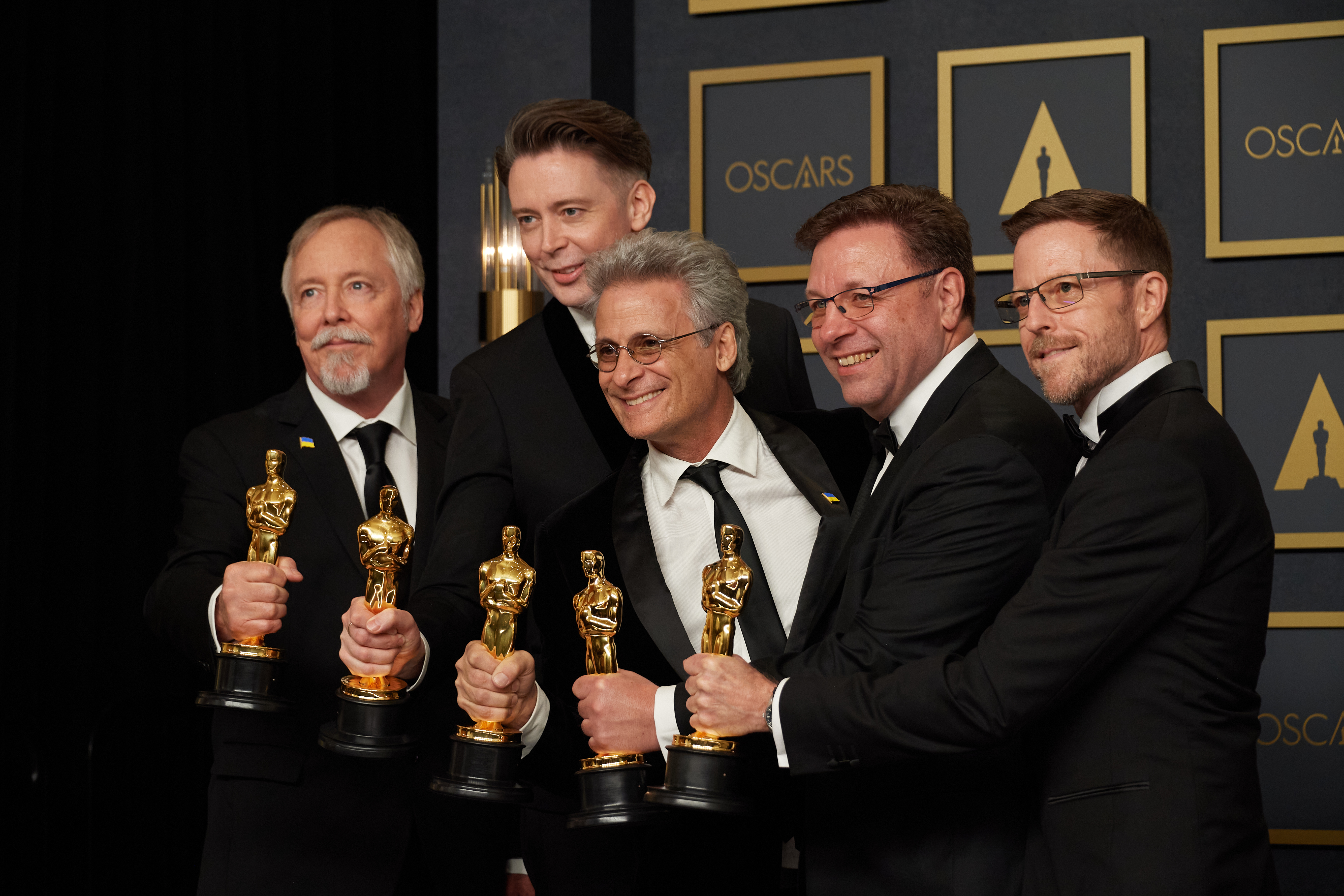 Filename: 94_PR_0159.jpg Size: 5,304w by 3,536h. 6,166,908 bytes Date: 03/25/2022 Download Hi Rez Preview Dough Hemphill, Theo Green, Mark Mangini, Ron Bartlett and Mac Ruth pose backstage with the Oscar® for Sound during the live ABC telecast of the 94th Oscars® at the Dolby Theatre at Ovation Hollywood in Los Angeles, CA, on Sunday, March 27, 2022. keywords: 94th Oscars, Academy Awards credit: Michael Baker / A.M.P.A.S.