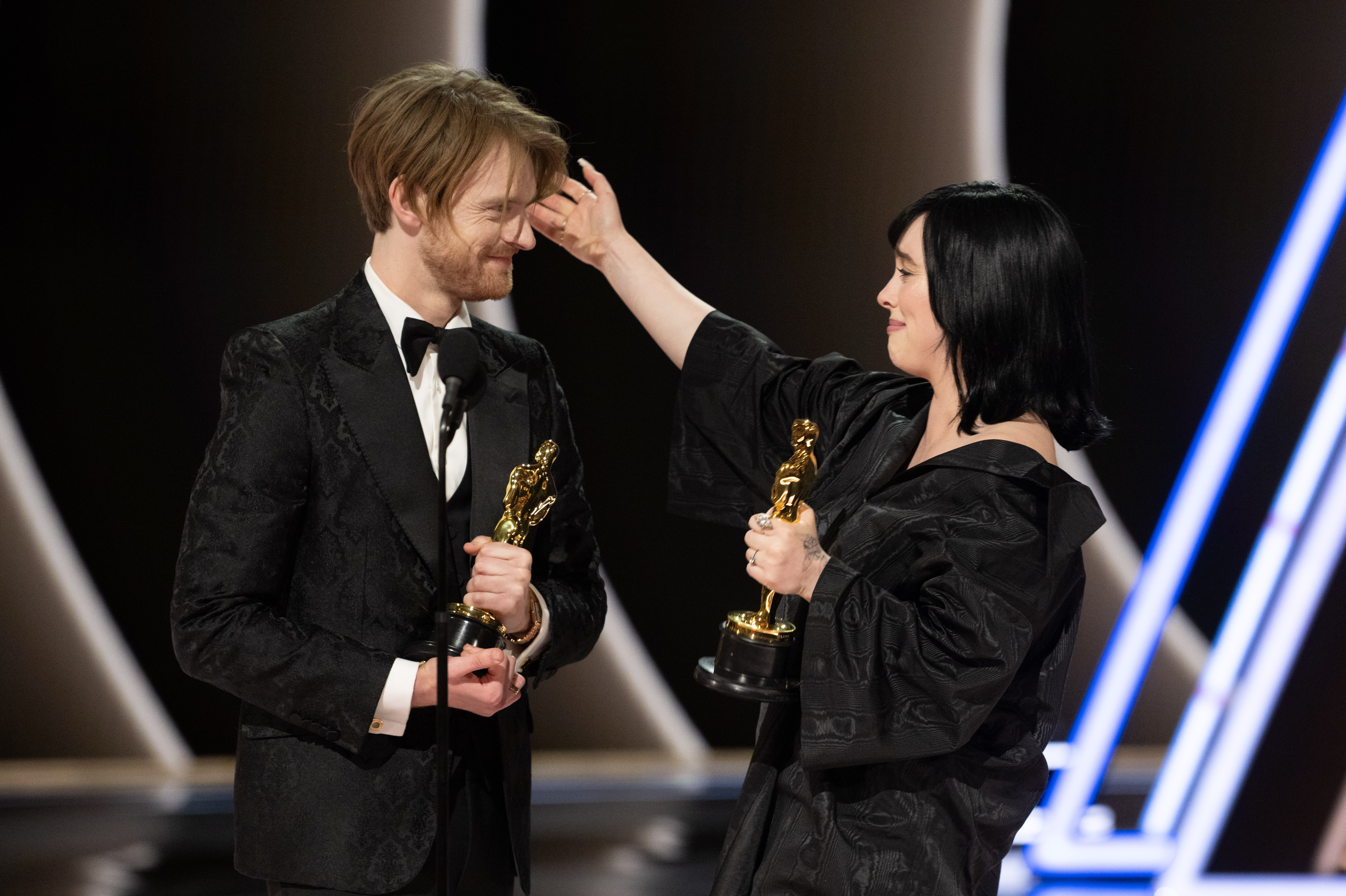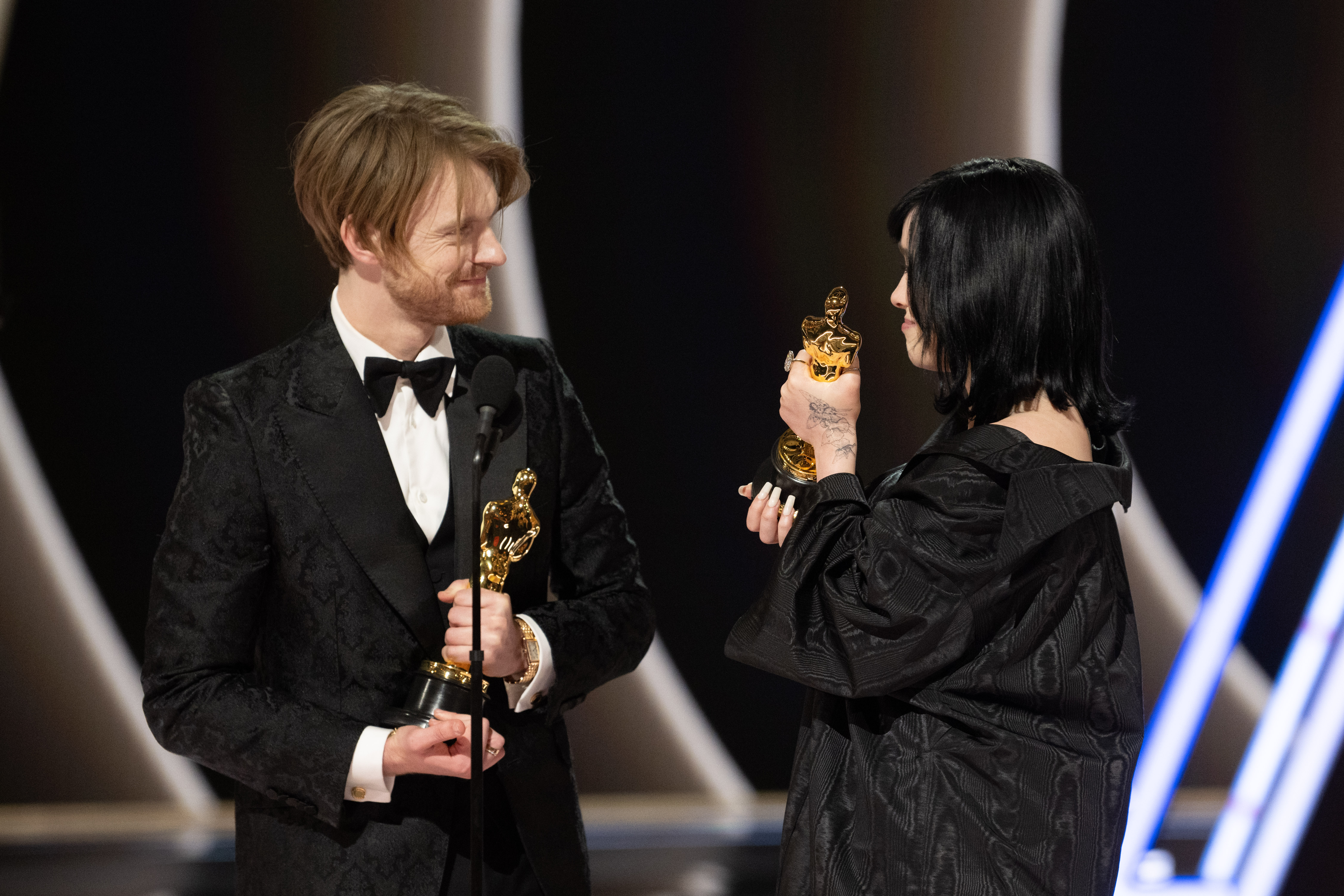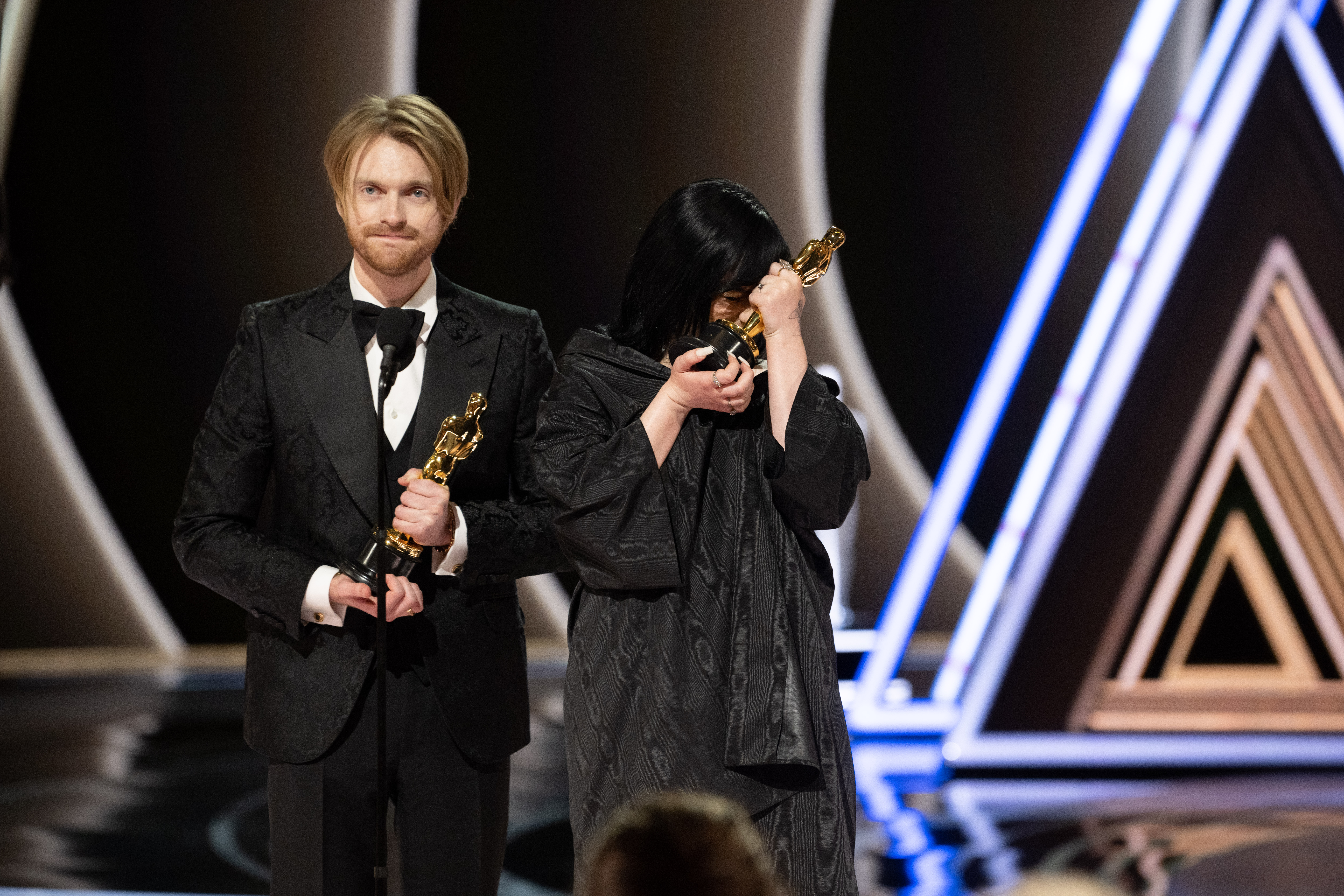 Filename: 94_TC_0828.jpg Size: 6,488w by 4,325h. 5,300,133 bytes Date: 03/25/2022 Download Hi Rez Preview Finneas O'Connell and Billie Eilish accept the Oscar® for Original Song during the live ABC telecast of the 94th Oscars® at the Dolby Theatre at Ovation Hollywood in Los Angeles, CA, on Sunday, March 27, 2022. keywords: 94th Oscars, Academy Awards credit: Blaine Ohigashi / A.M.P.A.S.