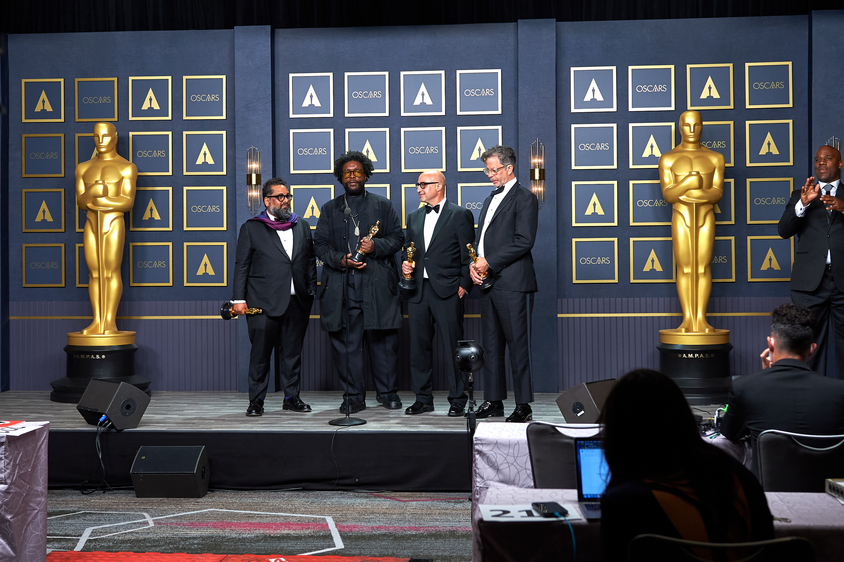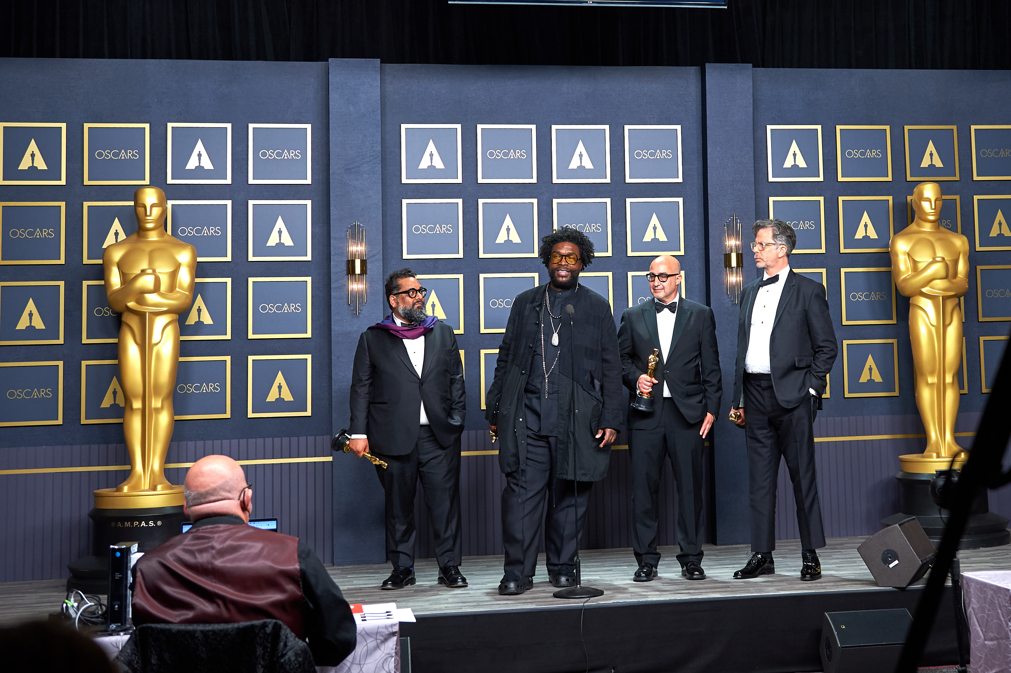Size: 3,404w by 2,265h. 3,369,911 bytes Date: 03/25/2022 Download Hi Rez Preview Ahmir "Questlove" Thompson, Joseph Patel, Robert Fyvolent and David Dinerstein pose backstage with the Oscar® for Documentary Feature during the live ABC telecast of the 94th Oscars® at the Dolby Theatre at Ovation Hollywood in Los Angeles, CA, on Sunday, March 27, 2022. keywords: 94th Oscars, Academy Awards credit: Michael Yada / A.M.P.A.S.