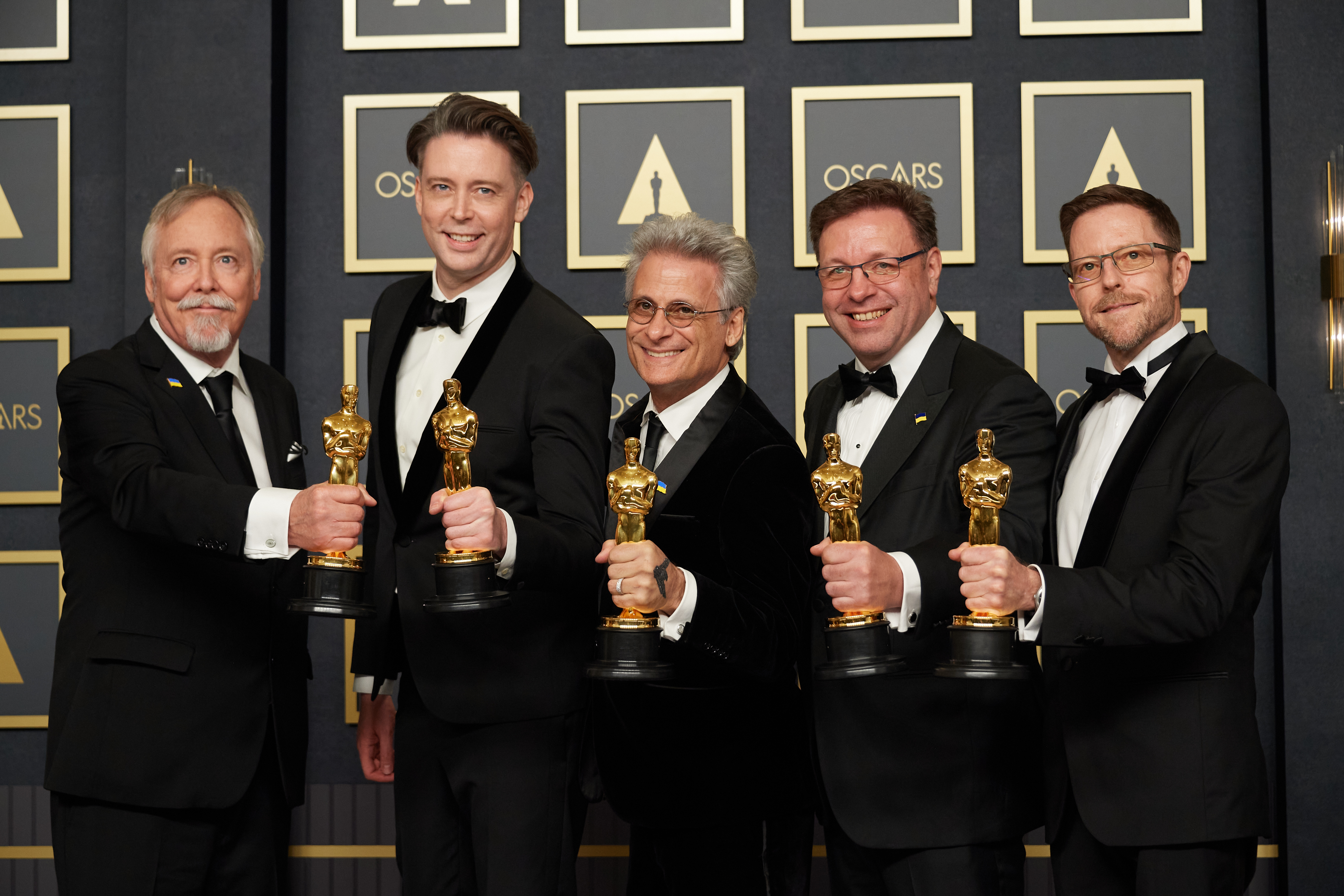 Size: 5,304w by 3,536h. 6,166,908 bytes Date: 03/25/2022 Download Hi Rez Preview Dough Hemphill, Theo Green, Mark Mangini, Ron Bartlett and Mac Ruth pose backstage with the Oscar® for Sound during the live ABC telecast of the 94th Oscars® at the Dolby Theatre at Ovation Hollywood in Los Angeles, CA, on Sunday, March 27, 2022. keywords: 94th Oscars, Academy Awards credit: Michael Baker / A.M.P.A.S.