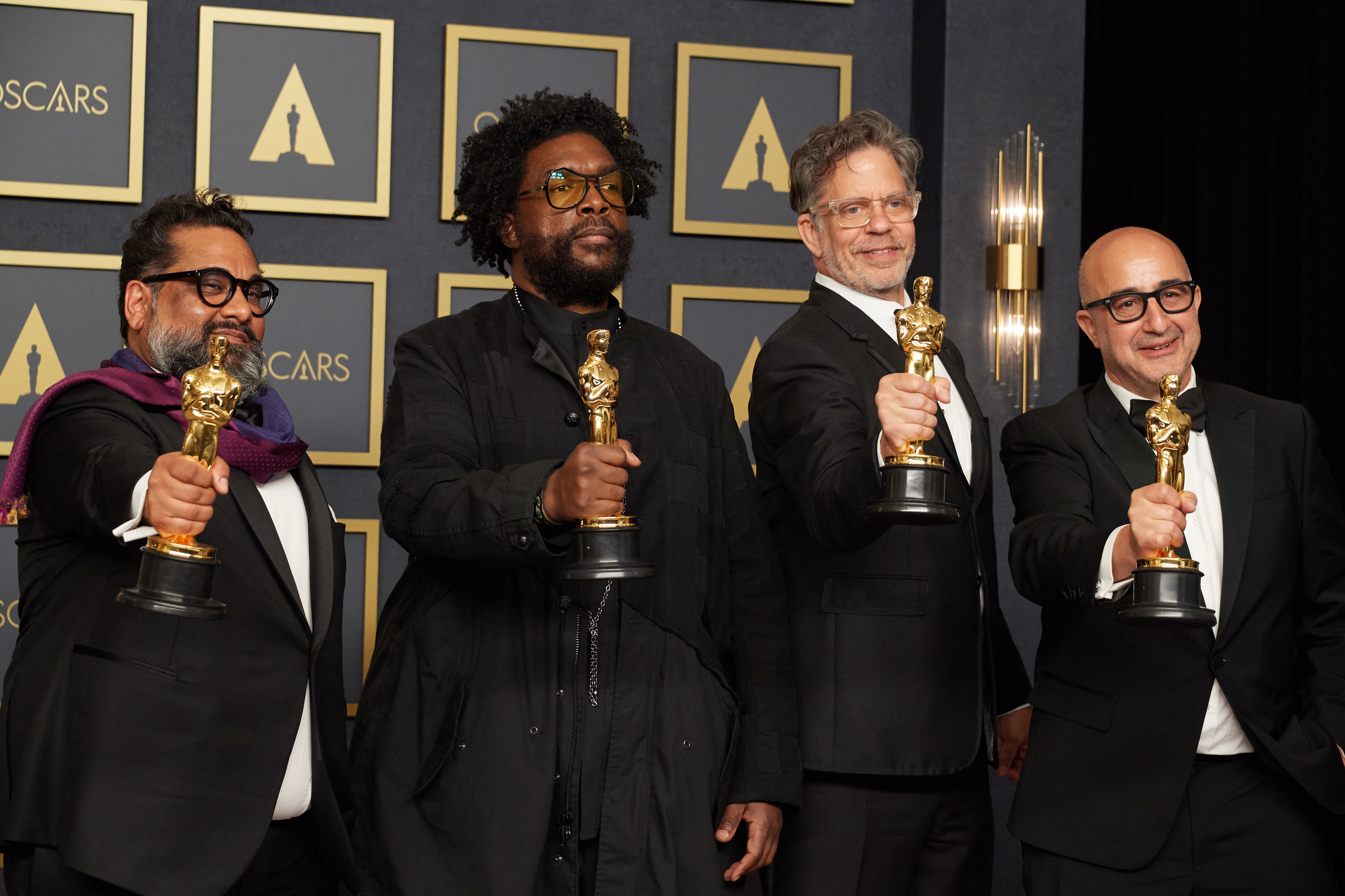 Size: 5,333w by 3,555h. 6,720,356 bytes Date: 03/25/2022 Download Hi Rez Preview Joseph Patel, Ahmir "Questlove" Thompson, David Dinerstein, and Robert Fyvolent pose backstage with the Oscar® for Documentary Feature during the live ABC telecast of the 94th Oscars® at the Dolby Theatre at Ovation Hollywood in Los Angeles, CA, on Sunday, March 27, 2022. keywords: 94th Oscars, Academy Awards credit: Michael Baker / A.M.P.A.S.